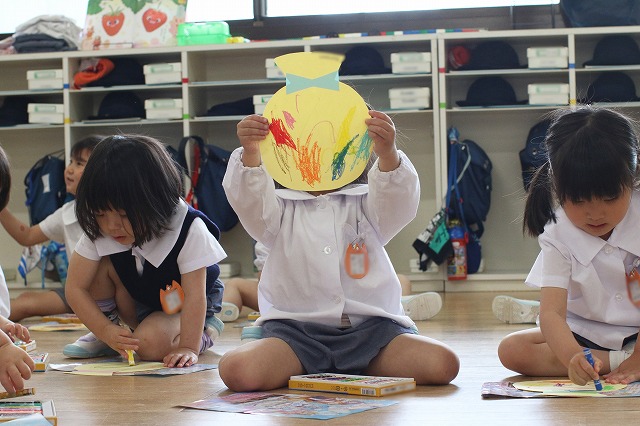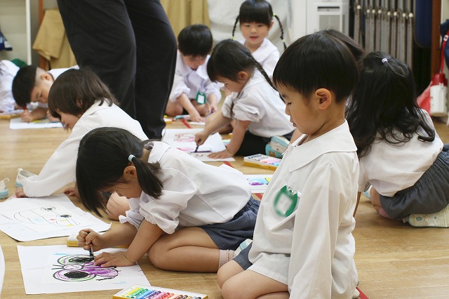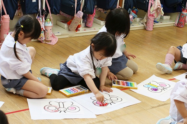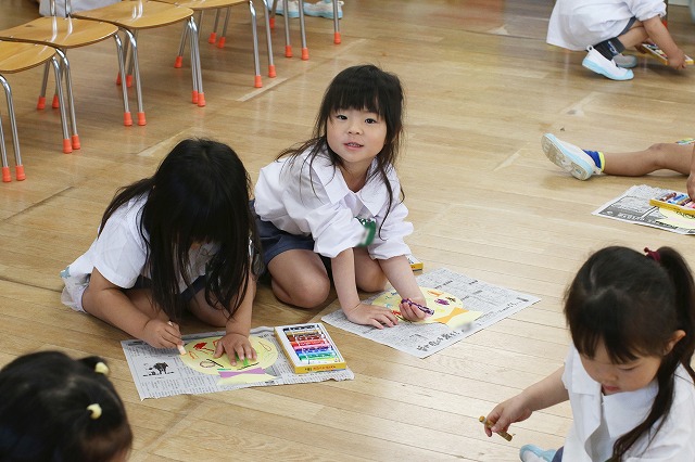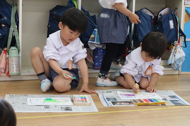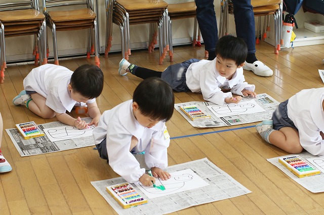 色を塗るのが楽しくていろいろな色を使ってみる子、色を考えながら塗る子、ダイナミックに塗り込む子・・それぞれ楽しんで塗っていました。