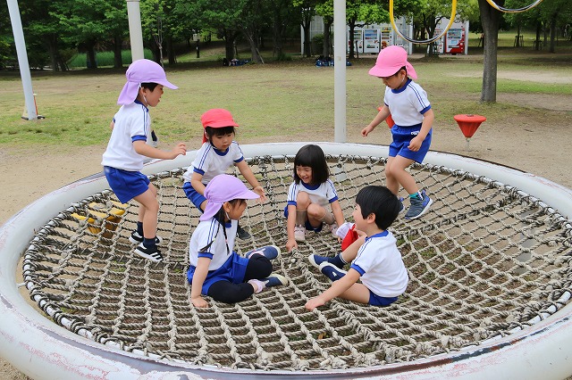 お友だちと「次は、どこへ行く?」とお話しながら回ったり、「クモの巣みた~い」と遊具の上に乗ってみたり・・