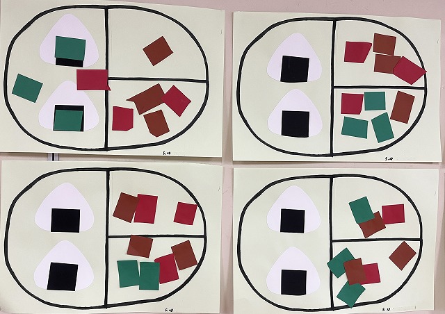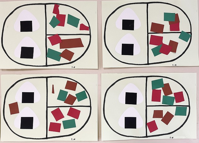 切ったものは、翌日のりでお弁当箱の画用紙にはりつけて完成させました。それぞれのお弁当が出来上がって、子ども達も大喜びでした。