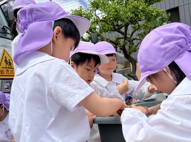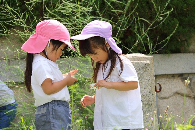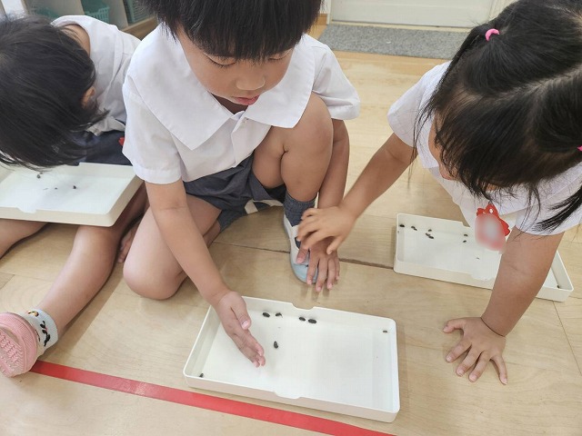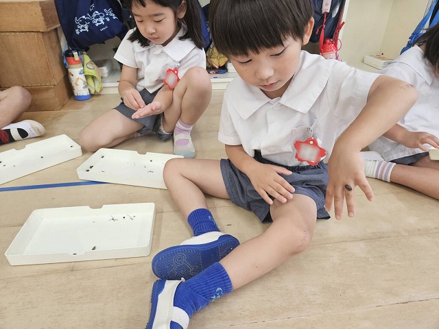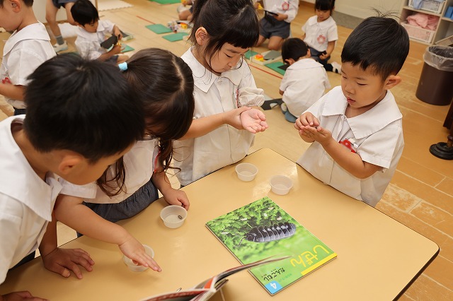 幼稚園にかえってきてから、それぞれのクラスでだんごむしを1人ひとり手に取って遊びました。クラスによっては、全部で何匹いるのか数えてみたクラスもありました。その数なんと181匹!!