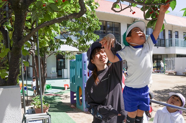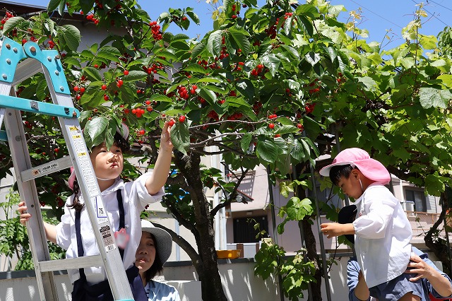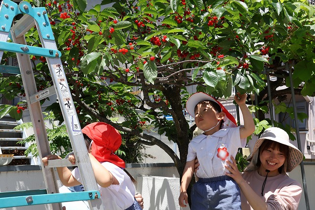 枝から実をちぎるとポロっと下に落ちてしまってもう一度取り直したり、髙いはしごの上に登るのが怖くて腰が引けてしまい、先生に支えてもらってさくらんぼをとったり、特にはじめての子は収穫体験に満足気な表情も見られました。