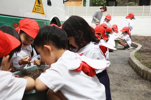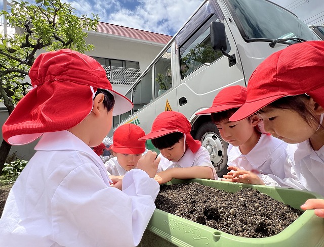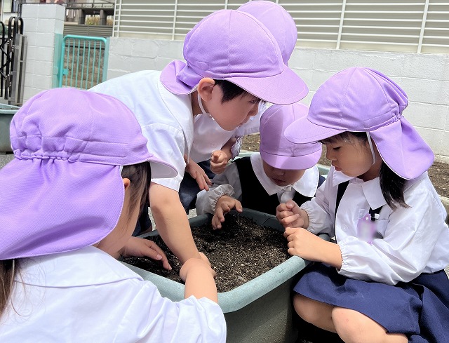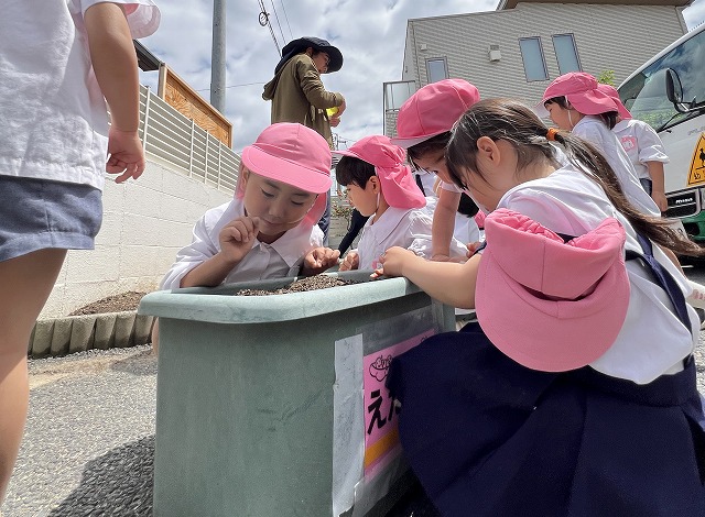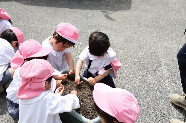 「コロコロ転がった!」と落としてしまった小さな種を必死で探しながら植えてくれた子もいましたが、周りに居たお友達も一緒に探してくれて無事見つかり、みんなで種を植えました。