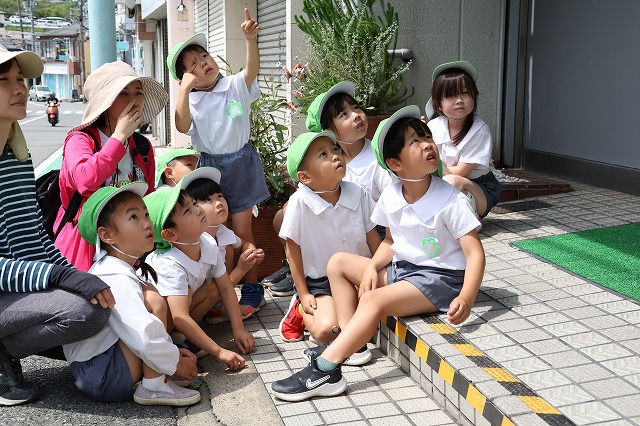 5月21日(水) 年長組さんが甲陽園にあるケーキ屋さん「ツマガリ」さんへつばめを見に行ってきました。 周辺にはいくつかの巣があり、バスに乗っている時からつばめが飛び交う姿が見られました。
