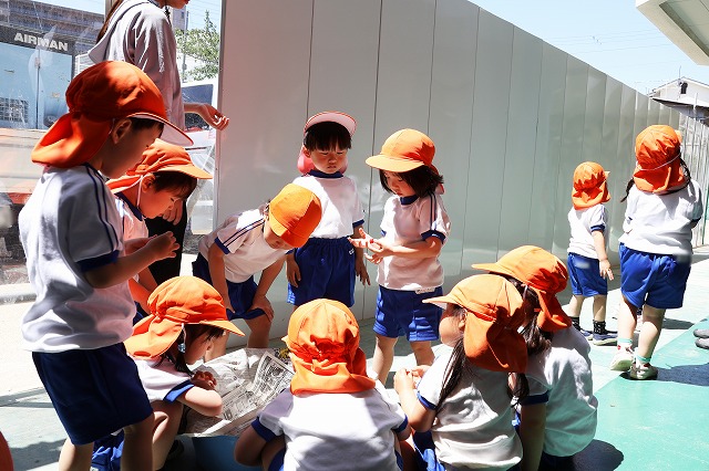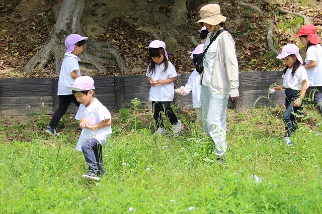 子ども達は、すべり台やブランコのある公園に行くと思い込んでいた子も傷みたいで、公園に着くと「えっ!何にもない・・」と言っている声もちらほら・・・(^^;) (先生たちは誰もすべり台など遊具があるとは言っていなかったのですが・・・笑)