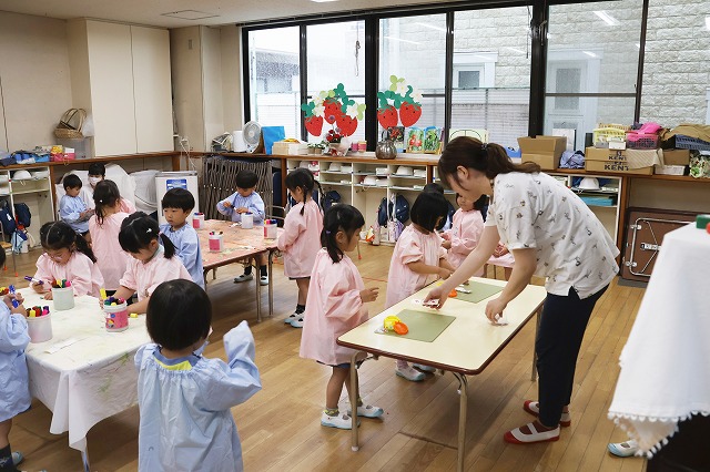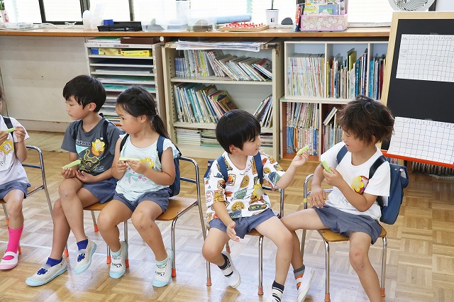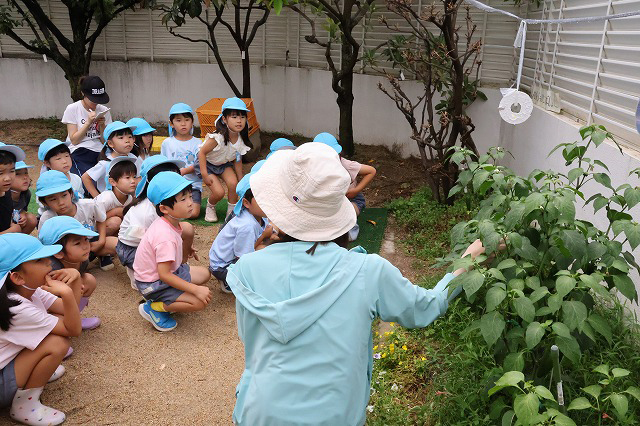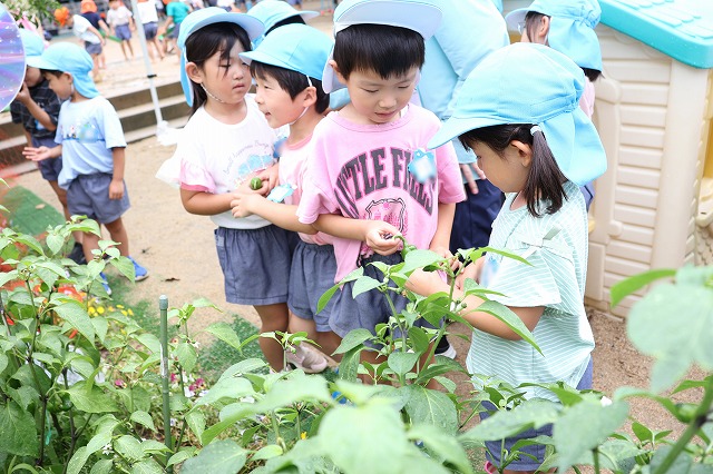 幼稚園で収穫したお野菜は、きゅうりだけではありません。ピーマンも次々と実ってきました。最初に見つけたのは、ふじ組さん。翌週23日(月)にもも組さん、すみれ組さんがそれぞれ収穫しました。こちらは2人で1個収穫しました。お母さん先生に半分に切ってもらって、種取りは自分達で。年少組さんで経験した子も多かったのですが、なかなかきれいにとるのは難しい(^^;)