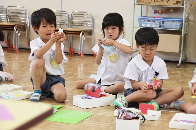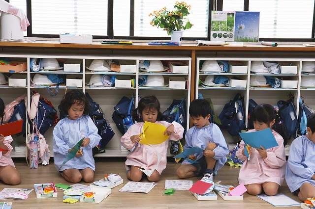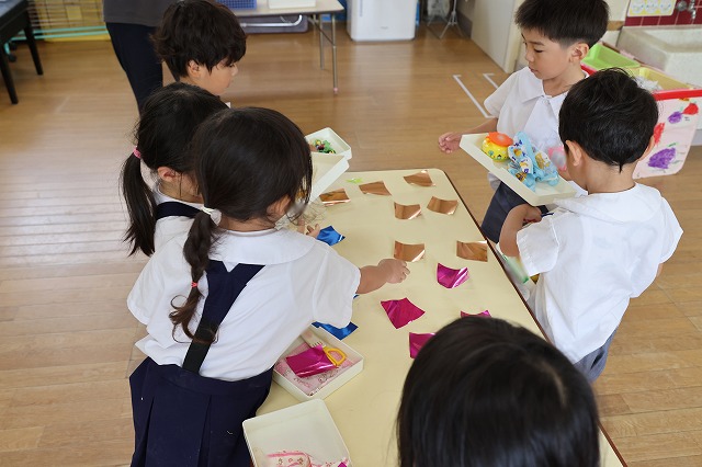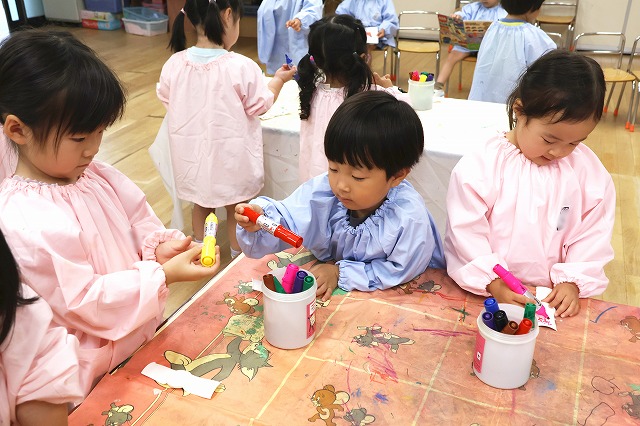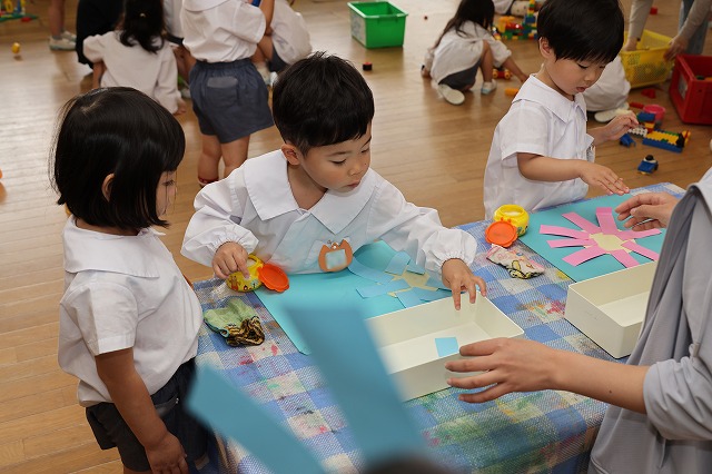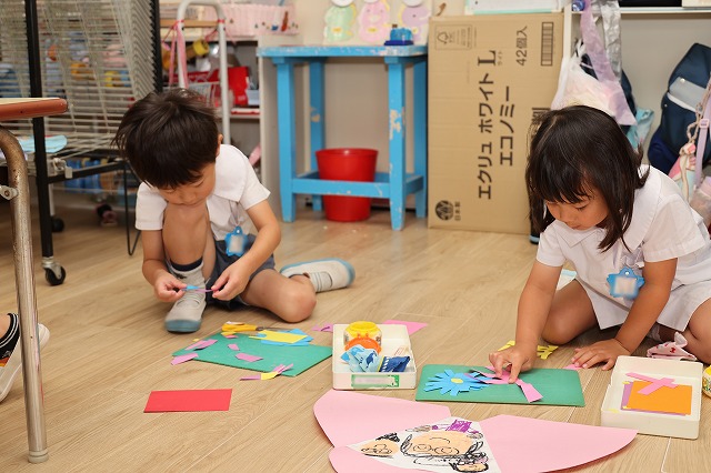 年長組さんは、絵を描いて、赤、オレンジ、水色、黄色…たくさん並んだ画用紙の中から、何色にしようかな~と自分で好きな色を選び、ハサミでチョキチョキ切りながらお花を飾ったり、想いのつまったプレゼントが出来上がっていました。
