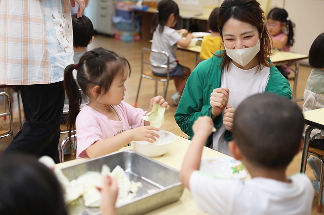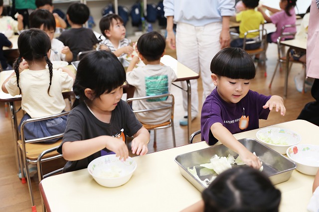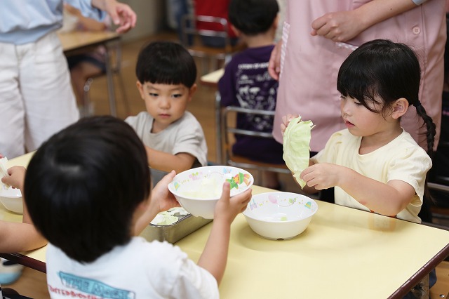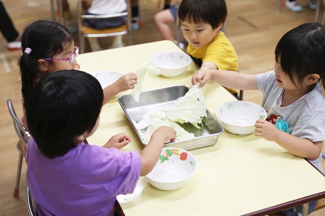 ということで、キャベツをちぎり始めた年少組さん。みんな真剣な顔つきでちぎっていました。小さく、小さくちぎっていく子。面白くてどんどん、どんどんちぎっていく子・・色々な姿が見えました。
