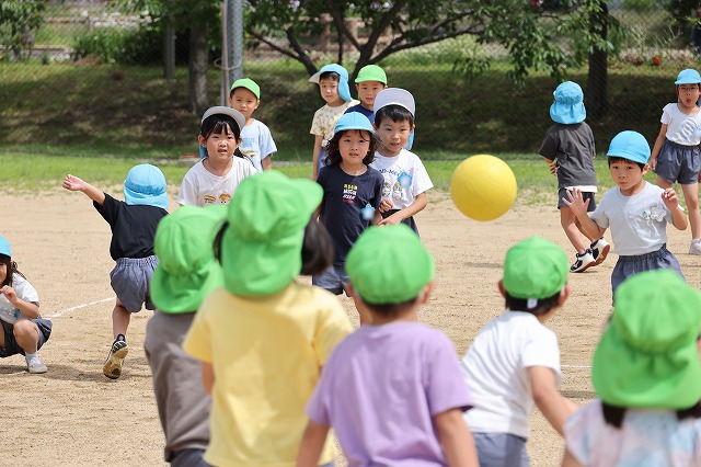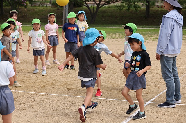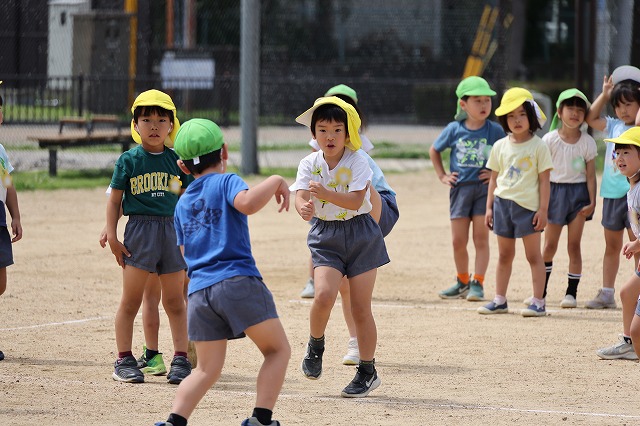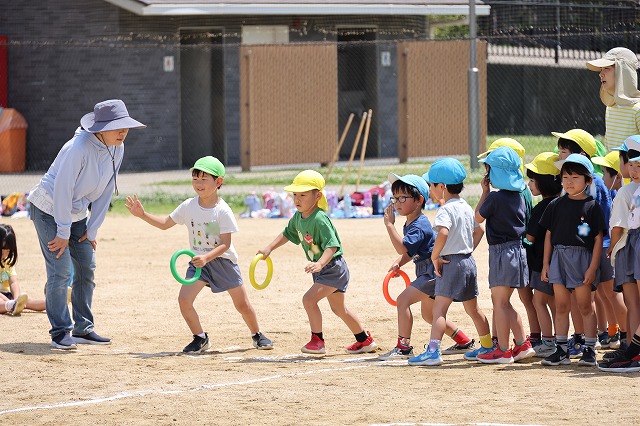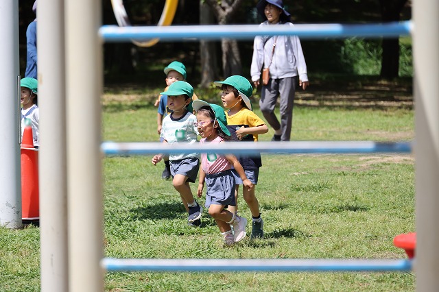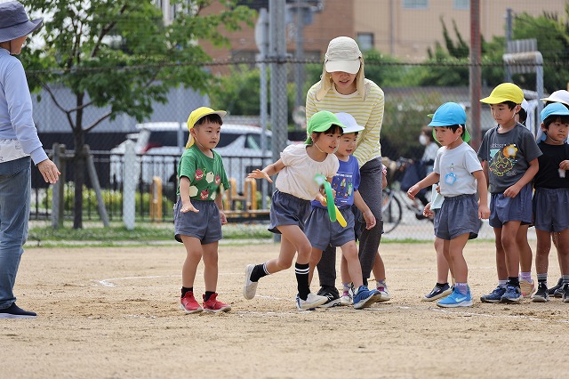 そして、今回はクラス対抗リレー(対抗・・とまではいきませんが、クラスごとのチームで行いました)今回、初めて全員で行ったのでルールがまだ曖昧な子もいましたが、まずはクラスのお友だちと1つのチームになって走り切って楽しむことができました。