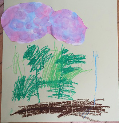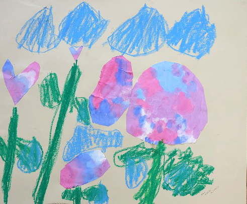 そして2日目。今度はそのあじさいを画用紙に貼って、葉っぱや茎をクレパスで描きました。幼稚園のあじさいの葉っぱや茎を見ながら描くと、「はっぱに線があるよ!」「くきにしろいせんみたいなのがついてる」などなど 発見もあったようです。