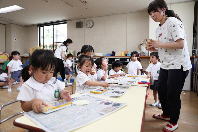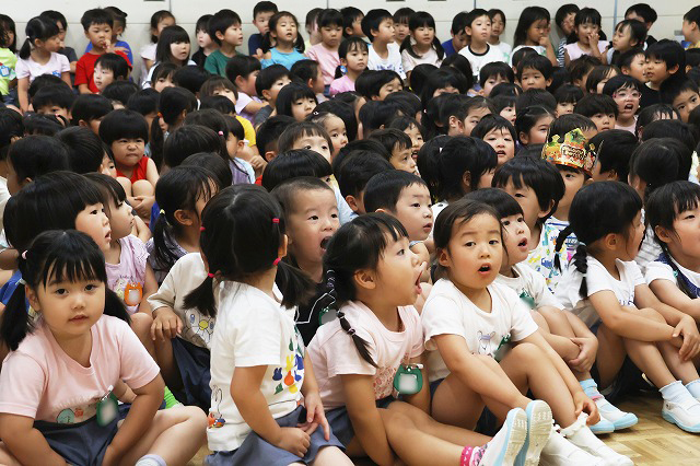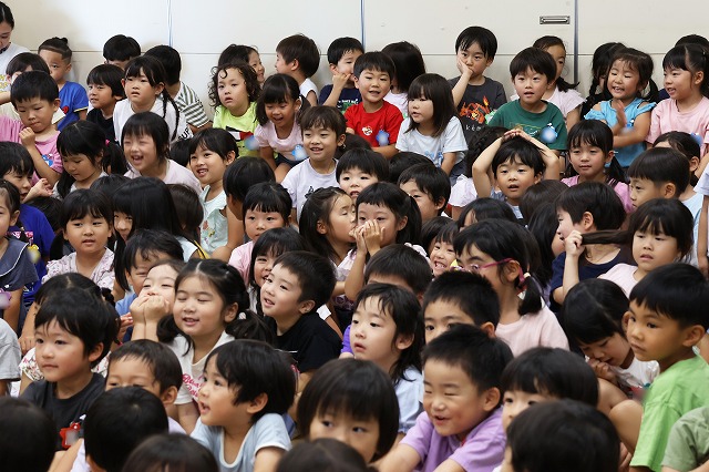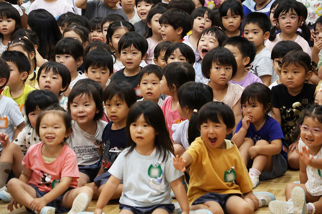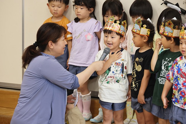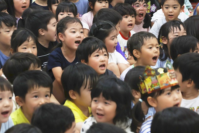 6月生まれのお誕生日会が開かれました♪ 16人の元気なお友だち(^^♪年長組さんに6月生まれのお友だちはいなかったので、年少組さんと年中組さんの16名のお友だちです。