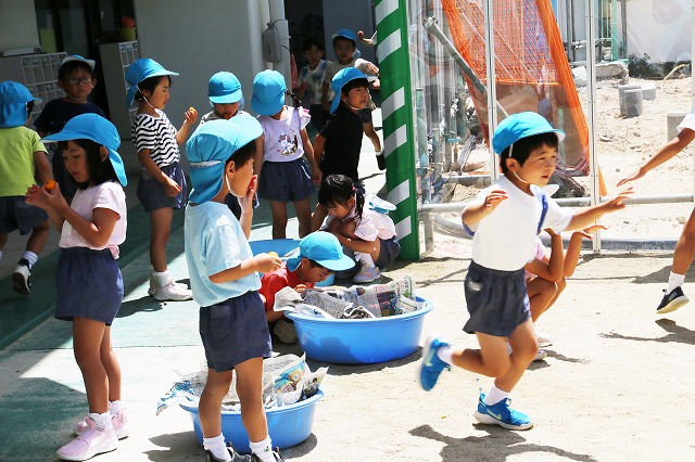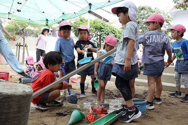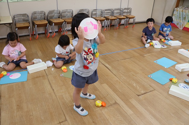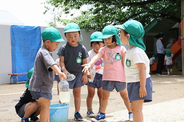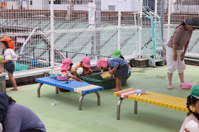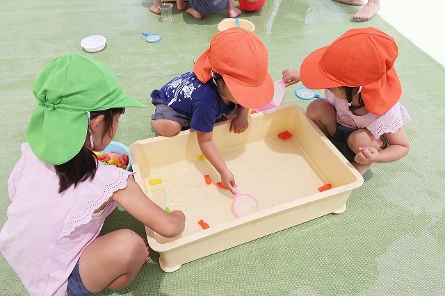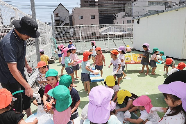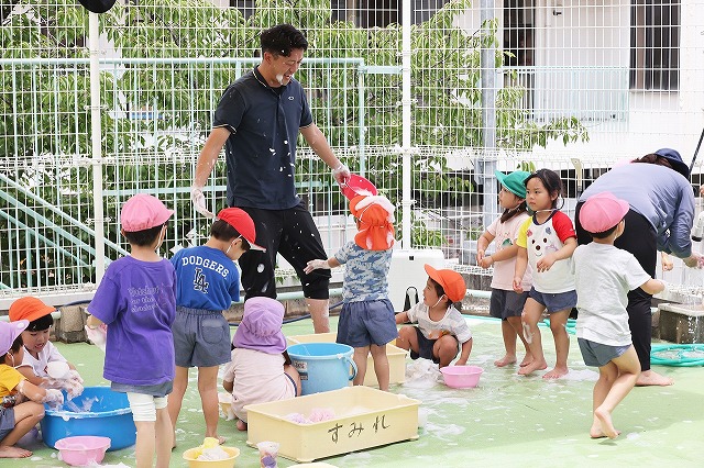 むし暑さが増してきた6月、水の心地良さも感じられる遊びをと計画したのが「Happy bubble」→泡遊び、「すくっチャオ!」→金魚(玩具)すくいです。ばら組の屋上を開放して泡遊びを楽しみました♪