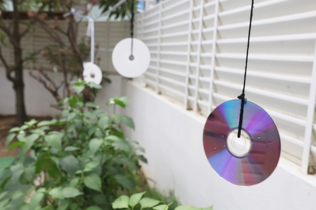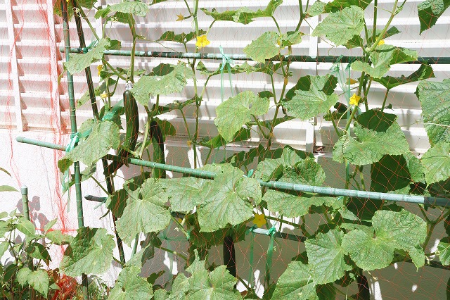 なかなか食べらない・・そこでネットをかぶせてきゅうりを守ることにしました。また、すみれ組さんがDVDをつるして、さらにカラスよけをしてくれました。