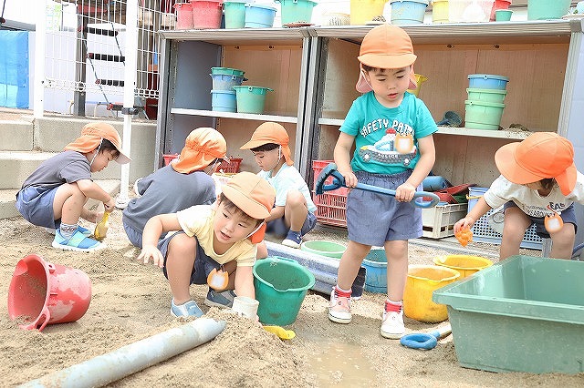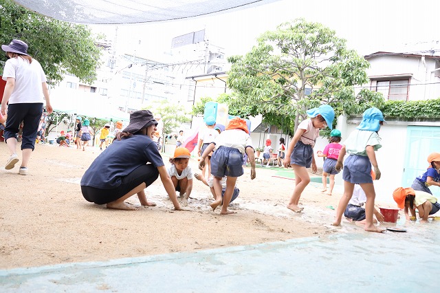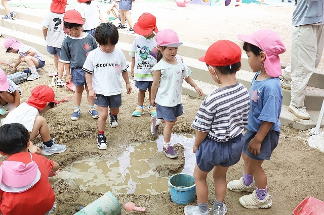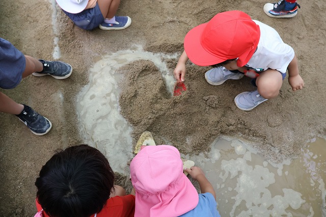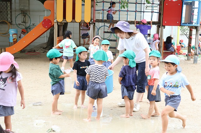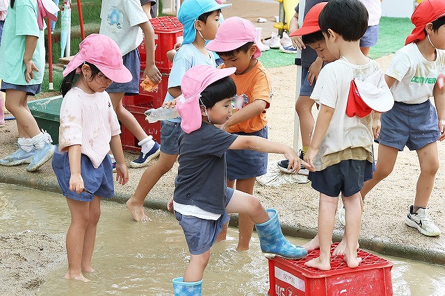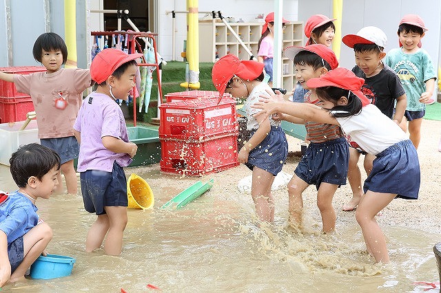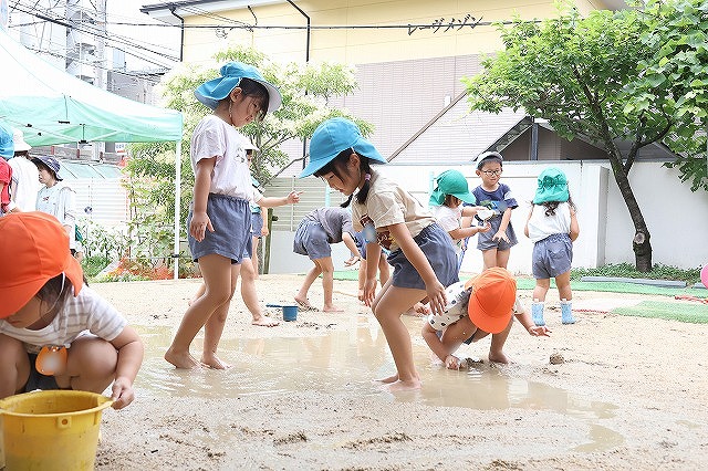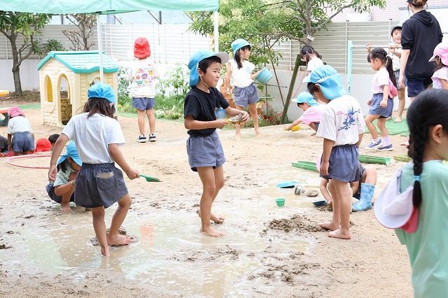 そして、たくさん雨が降った日は、砂場がどろんこプールに!!バケツを浮かべてみたり、お友達とかけ合いっこしたり、ジャンプして飛び込んでみたり…