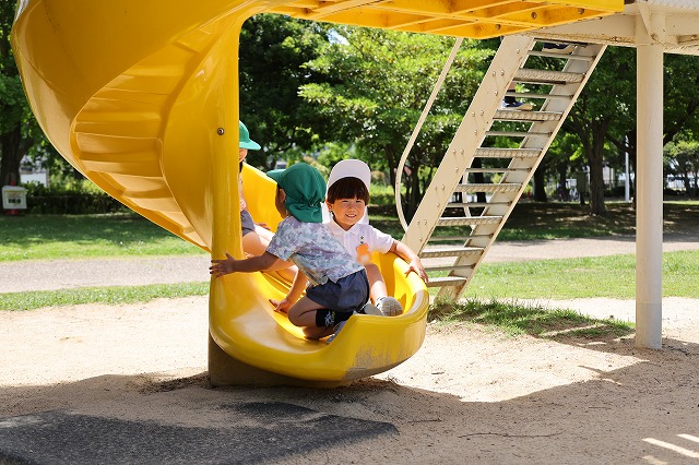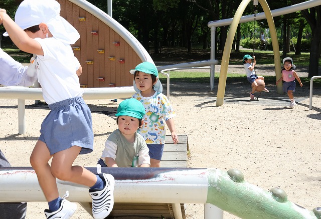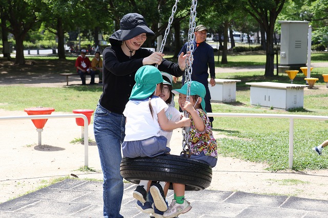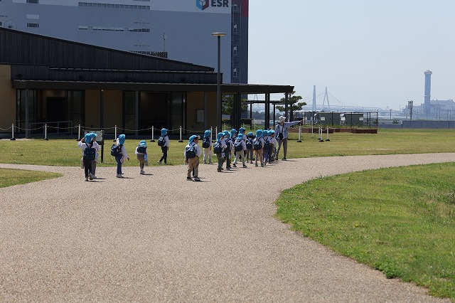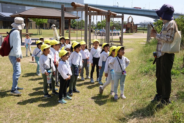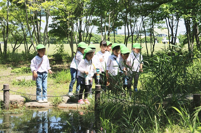 爽やかな天気の中、年長組さんがバスに乗って尼崎の森中央緑地へ行ってきました。尼崎の森中央緑地へは年中組さんのバッタとり、年少組さんではどんぐり拾いに来たことがある場所です。