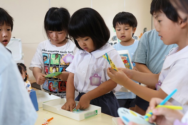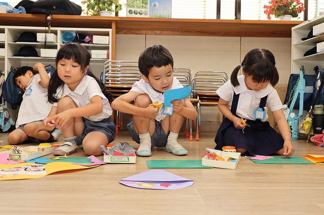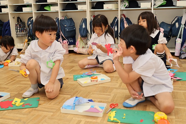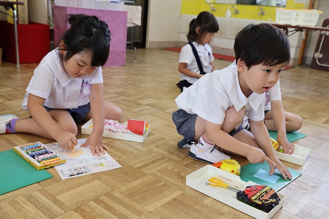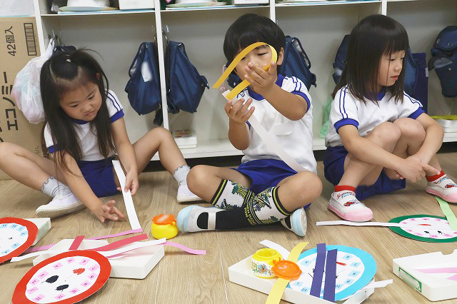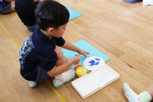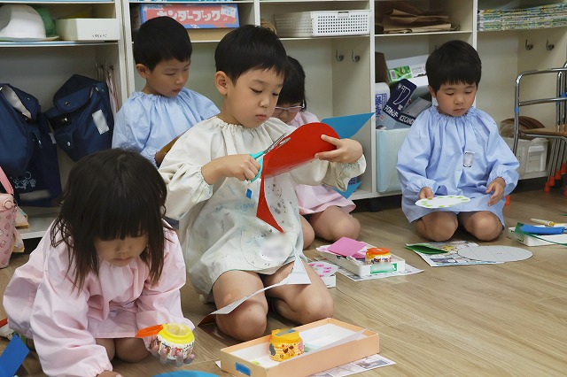 年中組さんは、お顔の絵を描いた後…ハサミを使ってキラキラ光る折り紙を切り、それぞれに楽しみながら模様を貼っていきます。好きな色合いでカラフルな模様ができていましたよ!