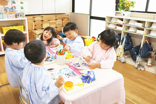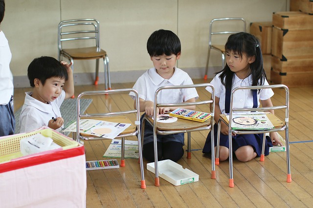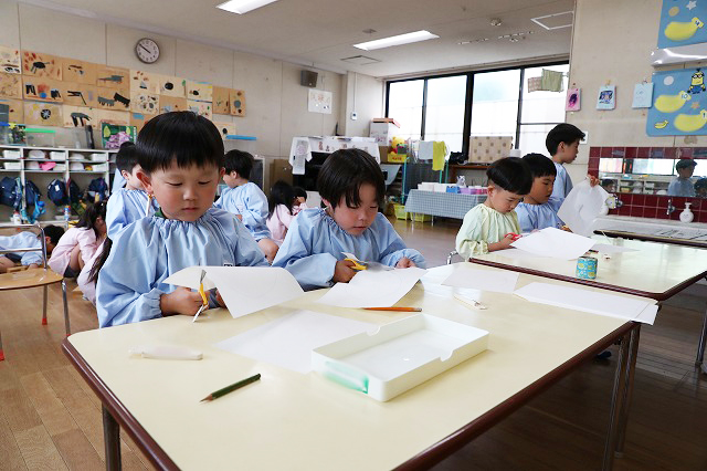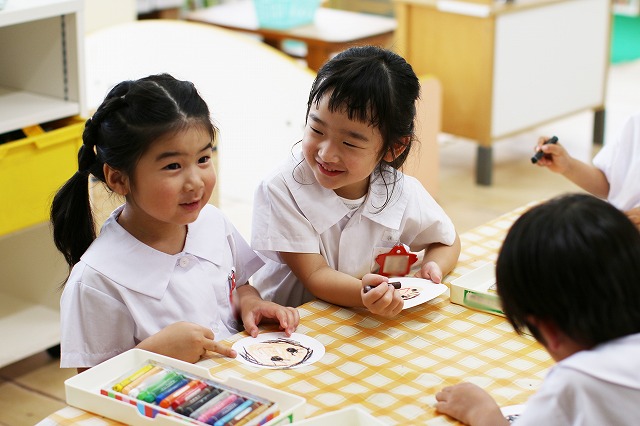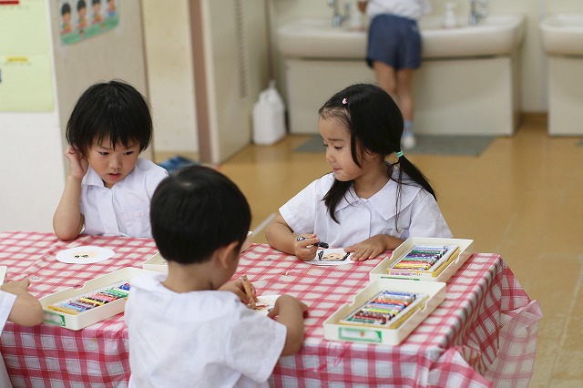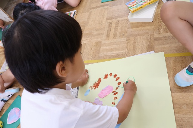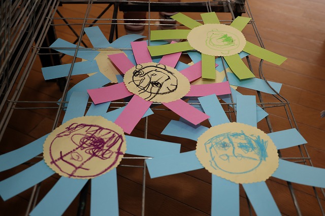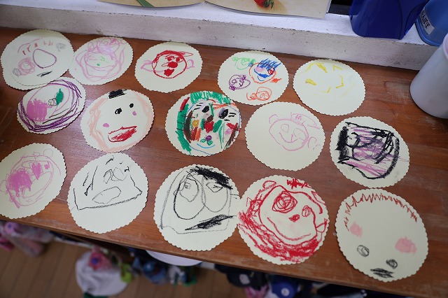 年少組さんは、にこにこ元気な自分のお顔を描いてプレゼントしよう!ということで、クレパスを使って頑張ってお絵かきをしました。そのお顔をお花のペンダントにしてプレゼントすることに♪