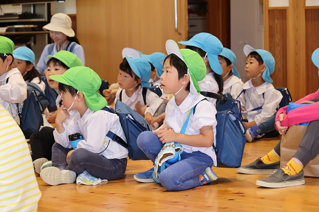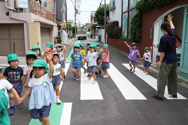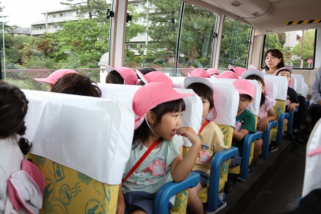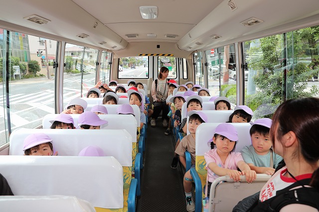 幼稚園のバスに乗るのも初めての子もいましたが、窓から見える景色をみてとっても嬉しそうでした。色々な車が見えると♪はたらくくるま♪のお歌を歌う子もいて、楽しいバスの旅になりました。