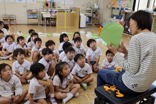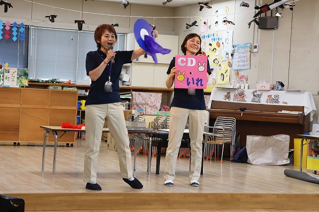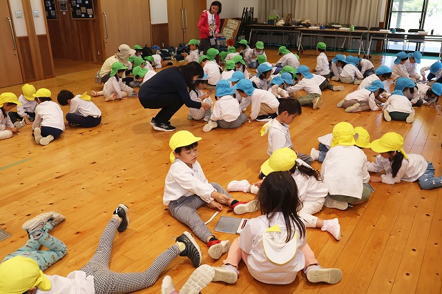 最初に、年少組さんが「とけいのうた」年中組さんが「ながぐつマーチ」年長組さんが「世界中のこどもたちが」をそれぞれ歌ってくれました。