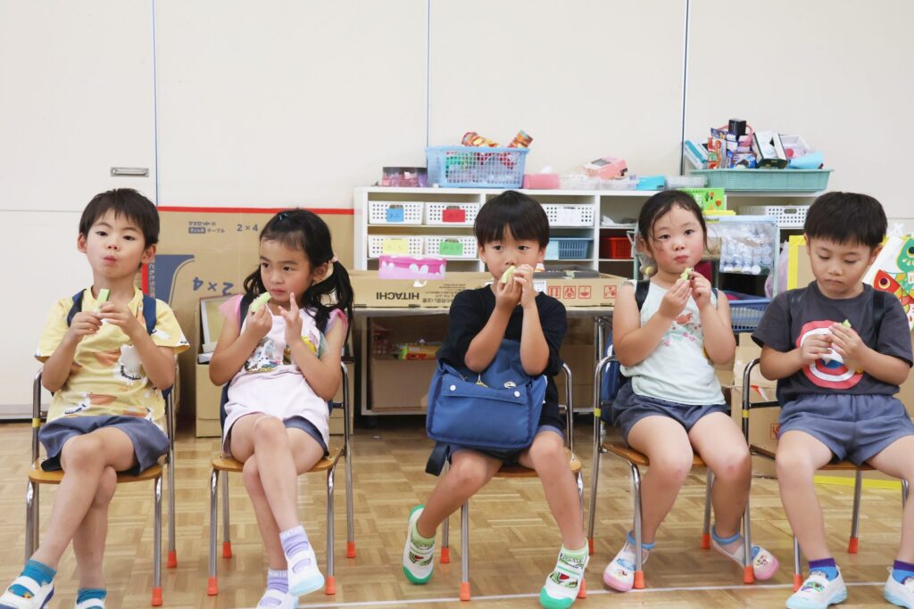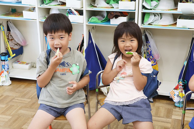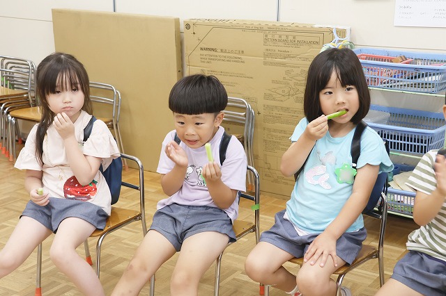 年長組さんは、スティック状に切ってもらいポリポリといい音をさせながら食べました。