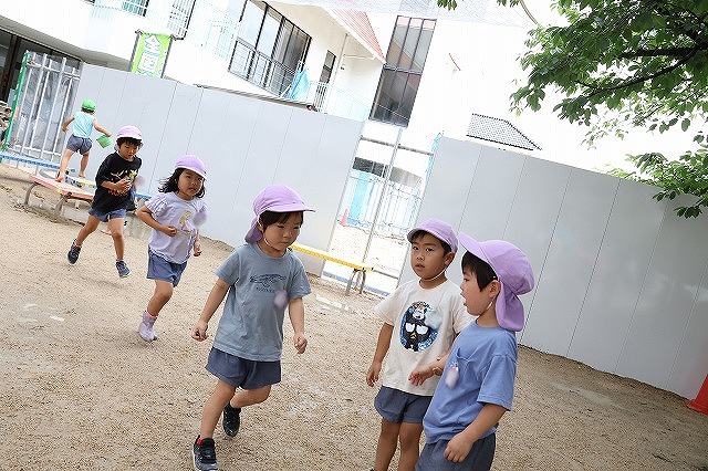 なかなかおそとに出られませんでしたが、週末木曜日から雨も止み始め、金曜日曇り空の気持ちの良いお天気になりました。そこで、年長組さんがいっぱい走って発散しに行こう!!ということで、急遽3回目となるグランドに行くことになりました。
