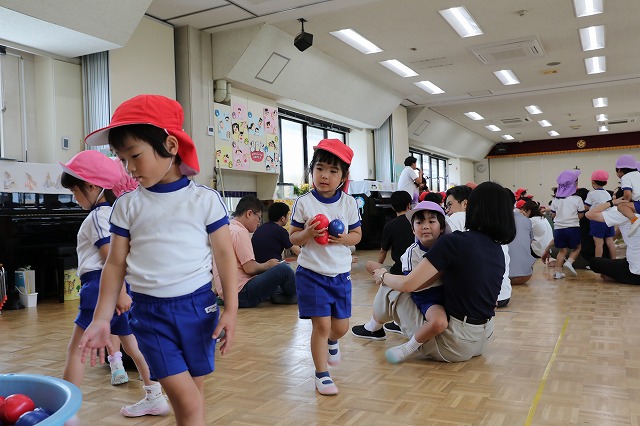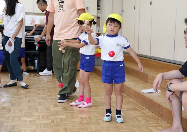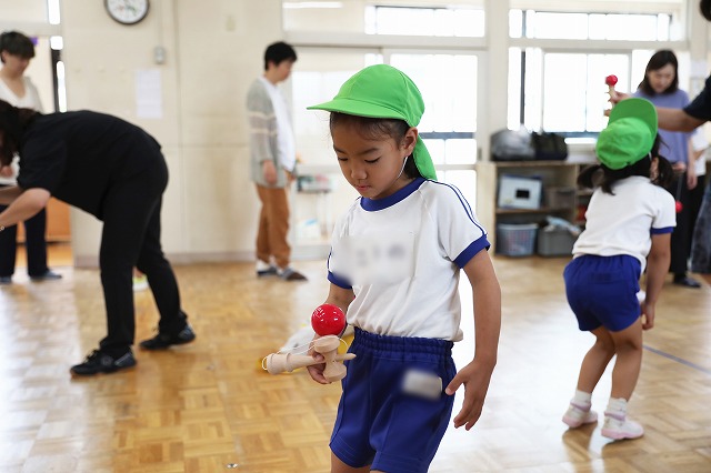 体操の後は、けん玉をお家の人に教えてもらいながら一緒に行いました。