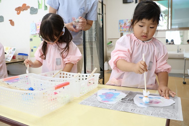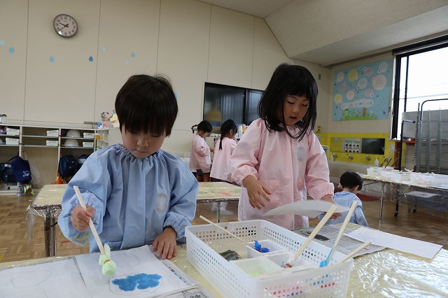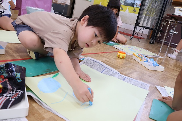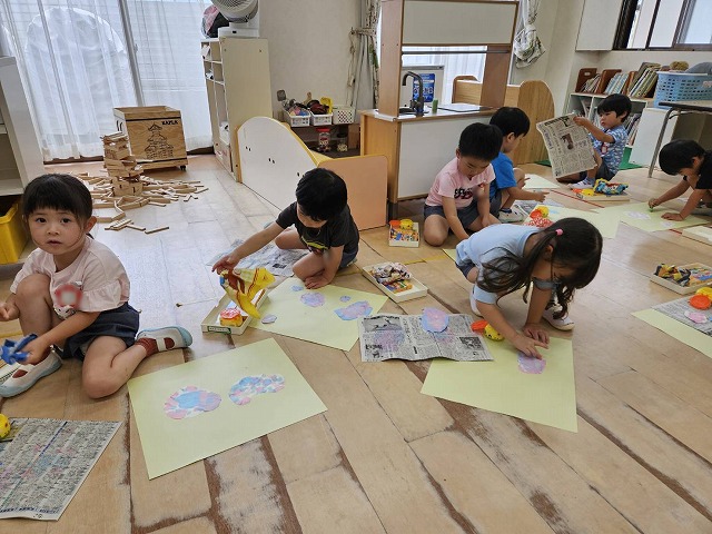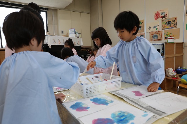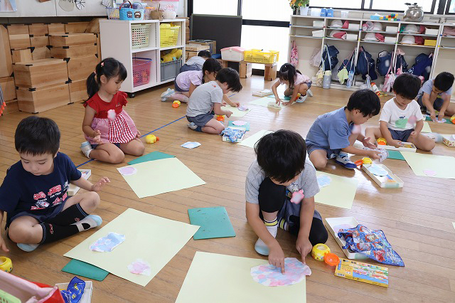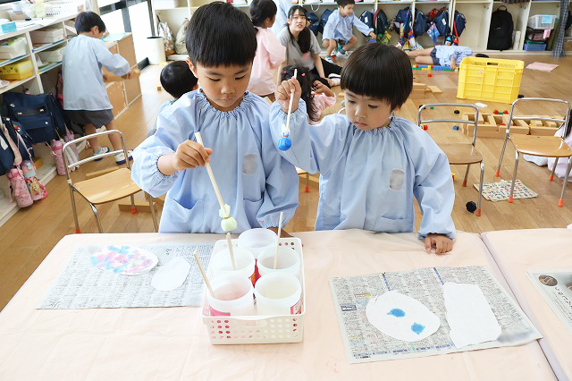 年中組さんは、障子紙を丸く切って、絵具を使ってポンポンと小さなお花を表現してあじさいのおはなを作りました。ポンポンとするのが楽しくて、たくさんポンポンしているうちに、きれいなあじさいのお花になりました。