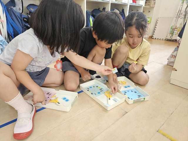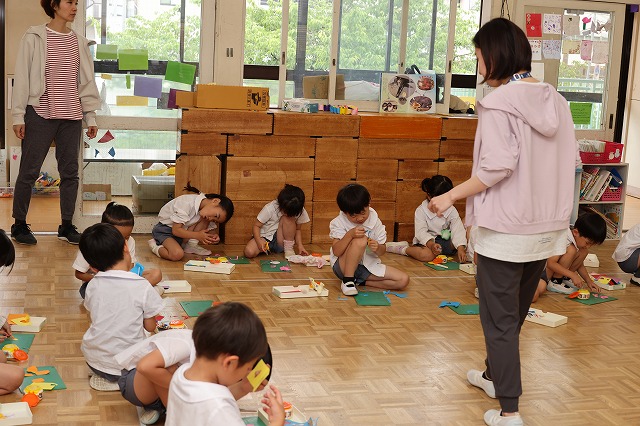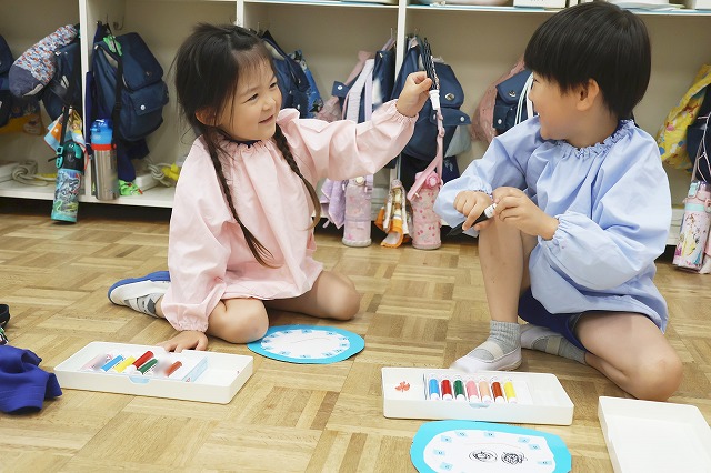 年中組さんは、文字盤に12時・3時・6時・9時のシールを貼るところから行いました。先生に教えてもらった後、自分でペタペタ。友だちと確認しながら貼っている子もいました。]