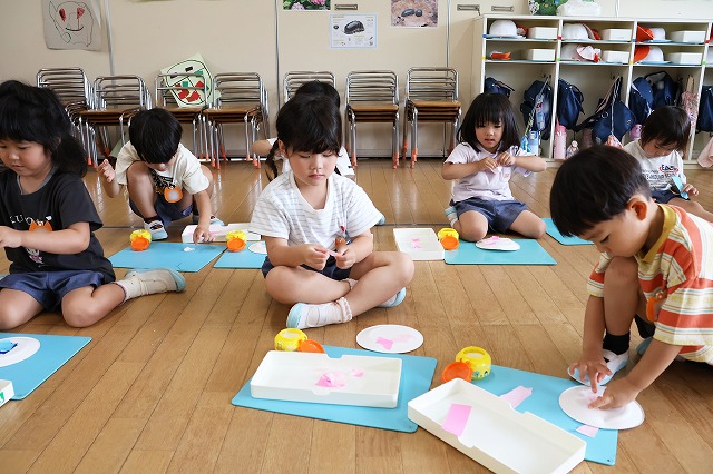 色紙をちぎってのりで紙皿にペタペタ。楽しく製作することができました。