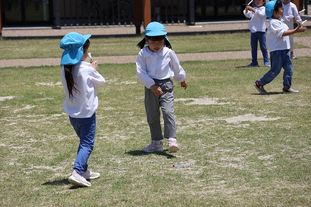 羽に好きな模様を描いて麦の茎と合体!お外で飛ばしてみました。最初は上手にできなくてポトンと落としてしまう子も多かったのですが、だんだん上手になってクルクルきれいに回って飛ばせるようになりました。