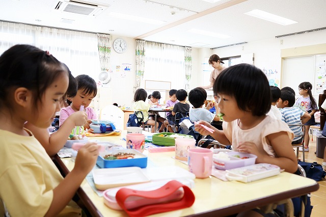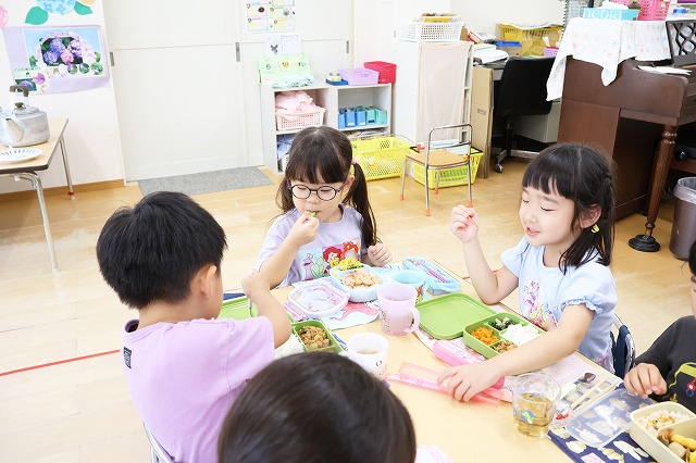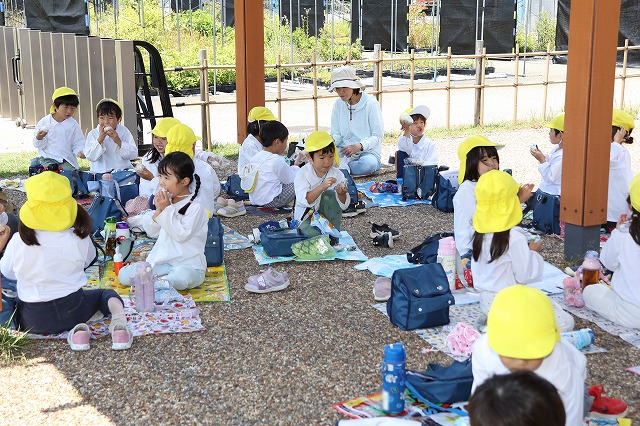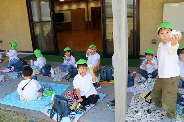 たくさん持ってきた子、大きな大きなおにぎりを持ってきた子 みんなもぐもぐほおばって、ごちそうさま~!