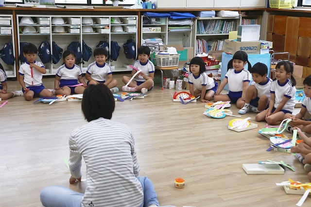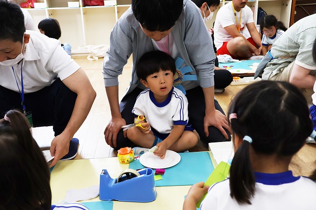 年少さんは、お部屋で紙皿に模様を描きお父さんお母さんと一緒にコマを作り、回して遊びました。