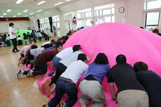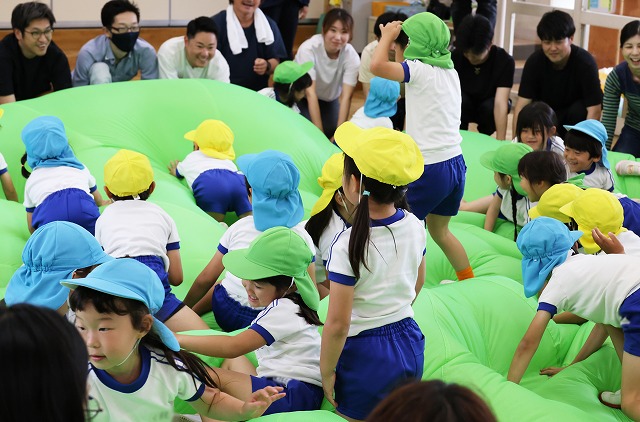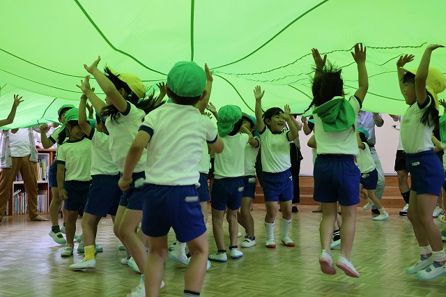 年長さんは、親子でふれあい遊びをした後にパラバルーンを使って遊びました。普段子ども達がどのように遊びを楽しんでいるか見てもらいましたよ。