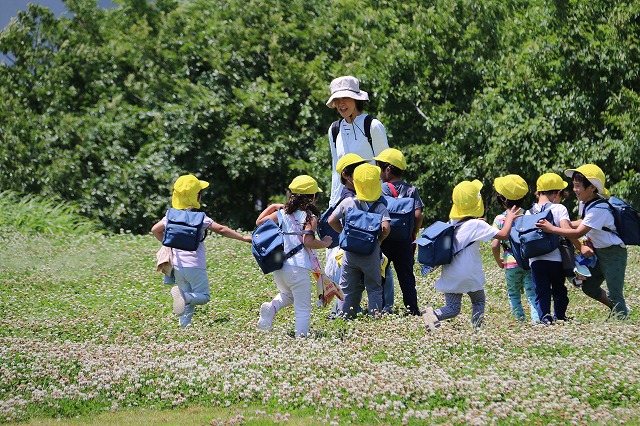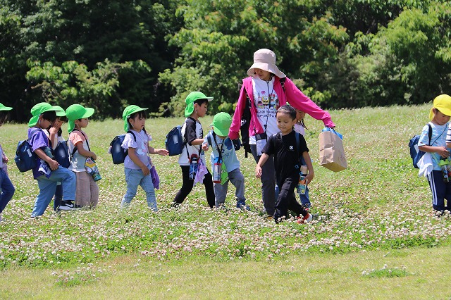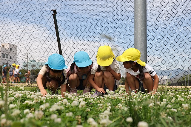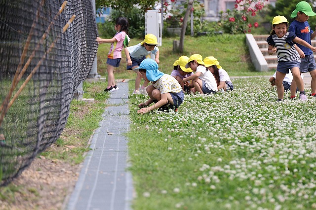 ドッチボールの後は、たくさんシロツメグサが咲いていたので、四葉のクローバーを見つけたり、サッカーをしたり、長縄とびをしたりとそれぞれに楽しみました。