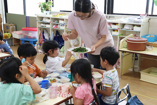 後は、お母さん先生に炒めてもらってお昼ご飯と一緒に頂きました。幼稚園のピーマンは、子どもピーマンなので苦くなくておいしい!!
