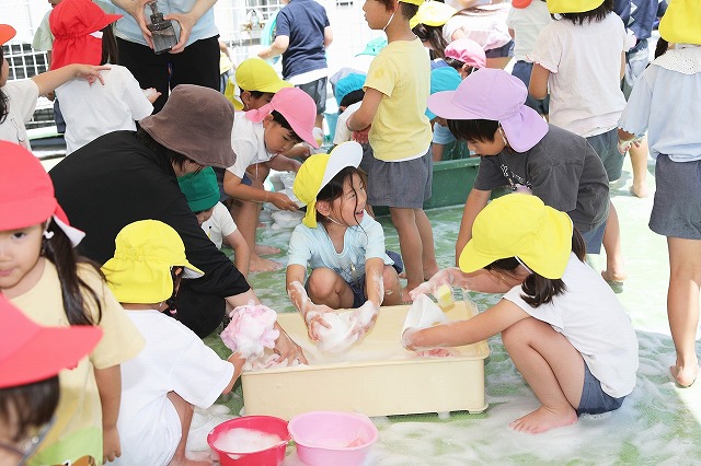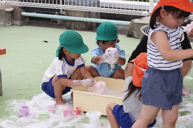 「きもちいい~」「あわあわ~!ふわふわ~」などの声が聞こえてきて、それぞれに泡の感触を楽しんでいました。