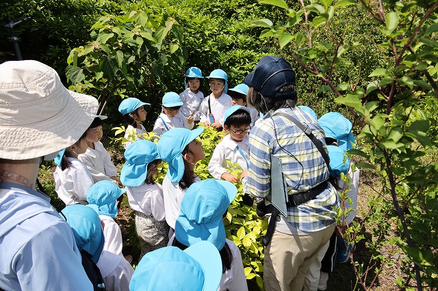 色々なにおいのする葉っぱを教えてもらったり、洋服に引っ付く小さな実(引っ付き虫)、破っても透明な糸が出てきて落ちない葉っぱなどなど 実際にさわったり破ったりしながら楽しみました。
