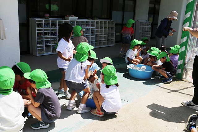 幼稚園の子ども達全員で食べるには数が足りず…今回は収穫した年長組さんで分ける事になりました。水で洗ったびわはピカピカ光っていて美味しそう~。上手に皮も剥けたようです(^▽^)/