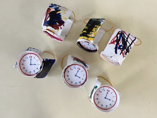 年少組さんは、紙コップを使って腕時計を作りました。