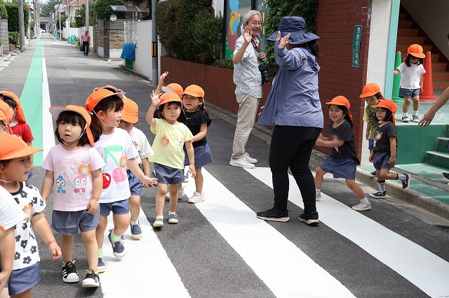 最後は警察官の方が来てくださって、横断歩道の正しいわたり方を教えてもらい敬礼も一緒にしました。みんなビシッと決まってカッコいい!!
