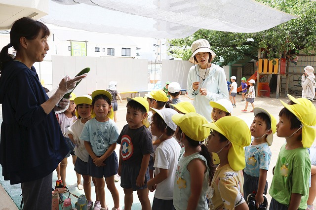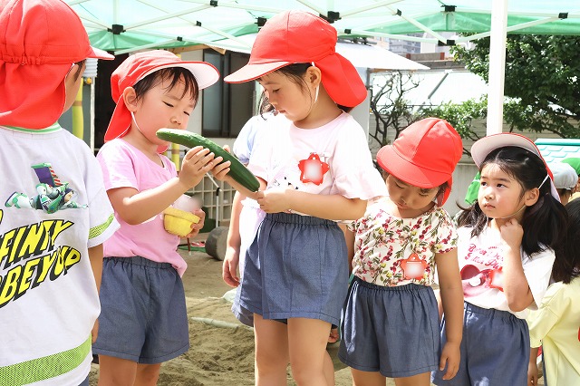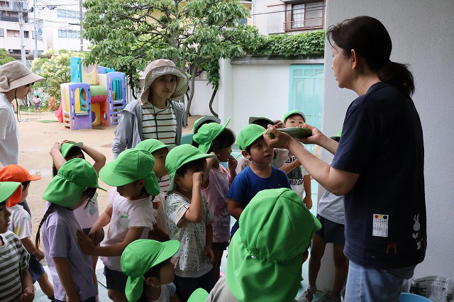 それぞれのクラスで選んでおいた大きなきゅうりを先生にチョキンと切ってもらい、お母さん先生、肥後先生にお願いして切ってもらいました。