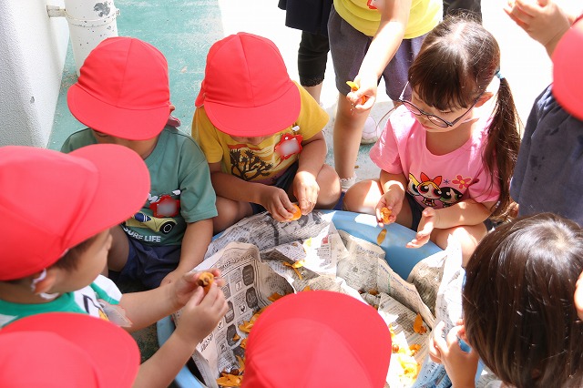 どんな味がするのかな?と最初はなめてみたりかじってみて、味見をしてからかぶりついている子もいました。「おいしい~」の声が聞こえてきて、タライを覗くと…大きな茶色の種がたくさん見えました。とってもきれいに食べられたね!!