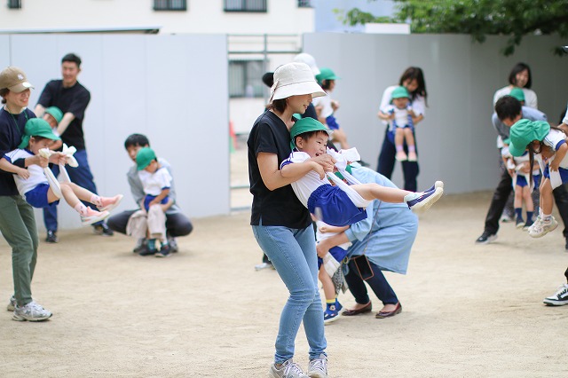 その後は~!!外に出てお家の人と一緒に体をいっぱい動かして親子でふれあい遊びです。
