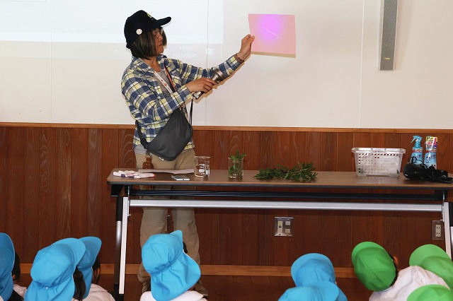 一通り森の中の散策が終わったら、建物に戻り先ほどみた引っ付き虫などの葉や実をマイクロスコープで拡大して見せてもらったり、不思議な木の枝を使って光る文字を描いてもらったり、光る水を見せてもらったりしました。