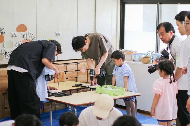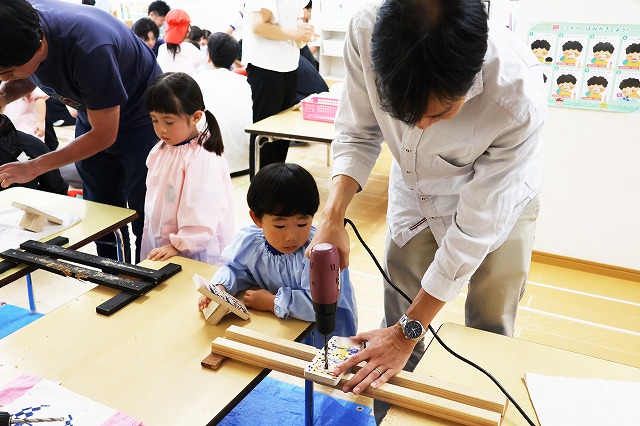 マジックで板に模様を描いて、お家の人が電動ドリルでひもを通す穴をあけてくれました。電動ドリルを使うお父さんお母さんの姿に子ども達はくぎずけでした。