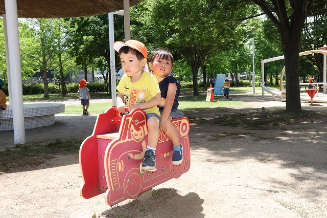 タイヤのブランコやすべり台、トランポリンのような遊具に動物さんの乗り物・・幼稚園にはない遊具にみんな大喜び(^^♪