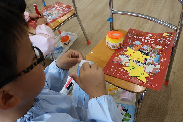 年長さんは先生に手伝ってもらいながら自分でねがいことを書いてみたり、星型の織姫彦星に顔を描きかわいく仕上げていましたよ♪