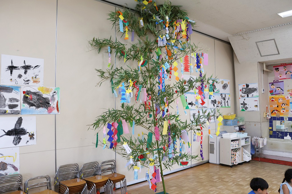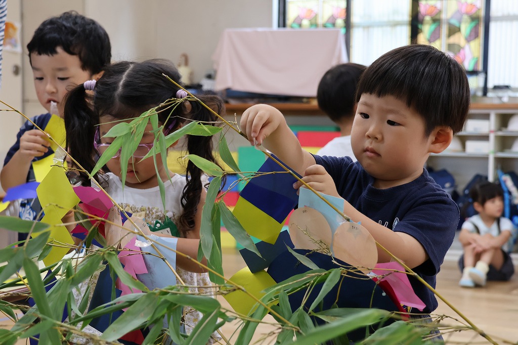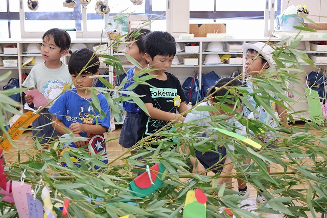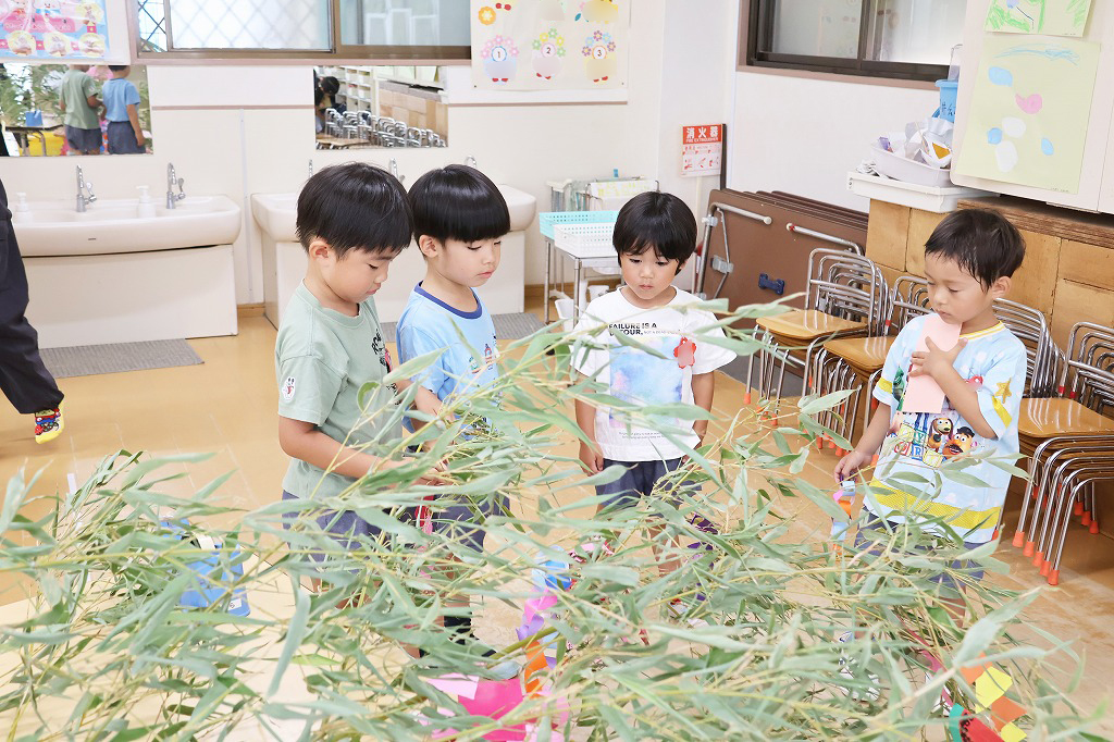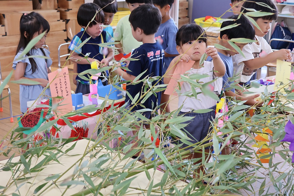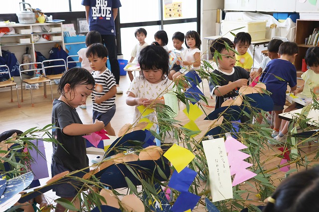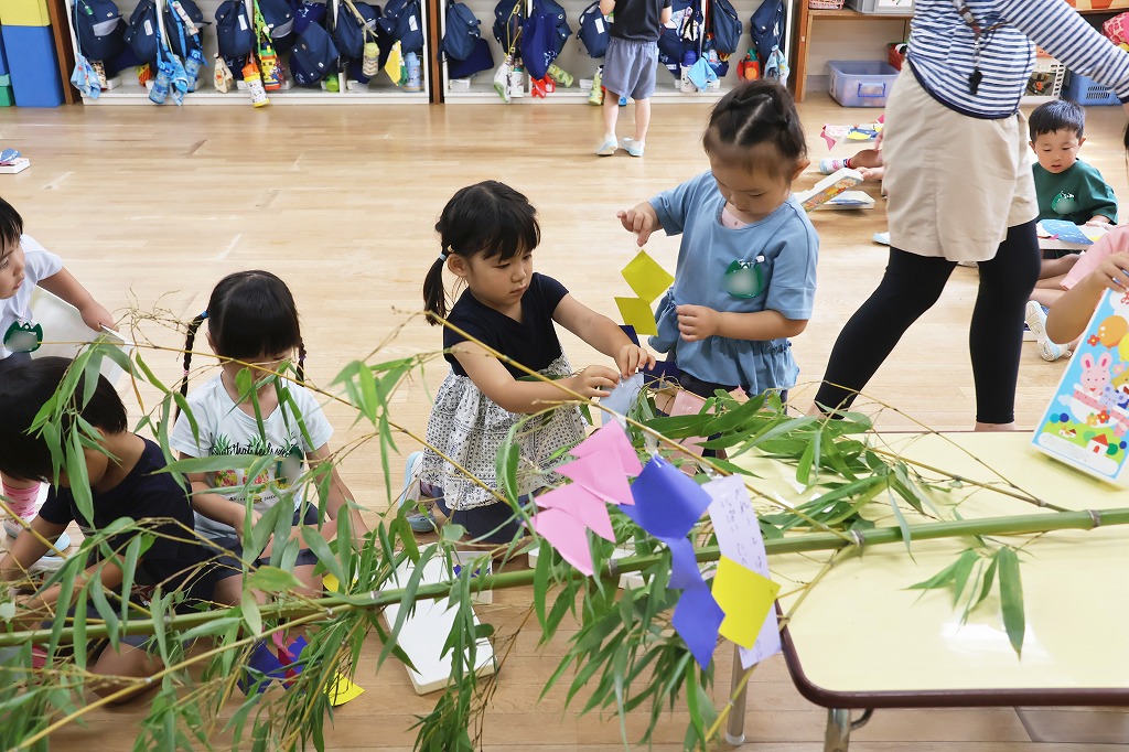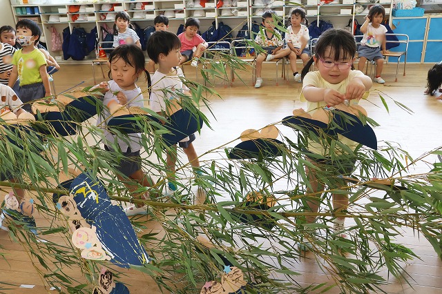 年少組さん、自分で作った折り紙の飾りやねがいごとが書かれた色画用紙を真剣な顔で笹にくっつけています。いろとりどりにたくさんの飾りがついてみんな嬉しそう~。いろんな角度から何度も眺めている子の姿もみえました。