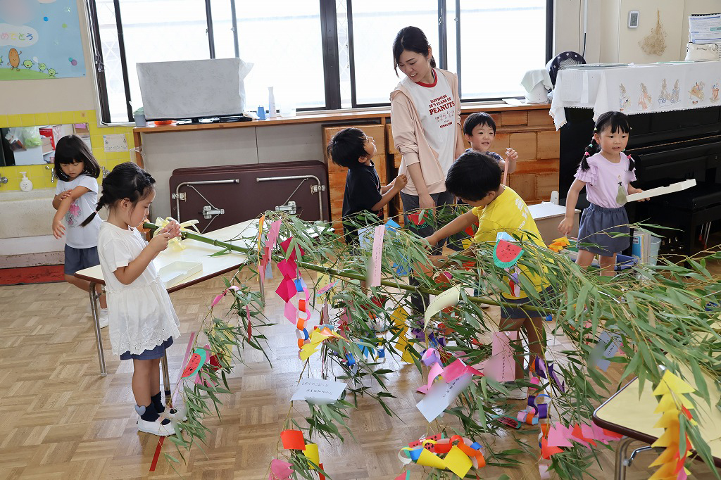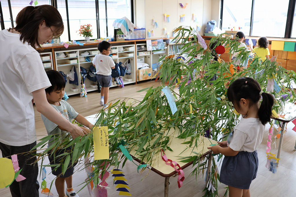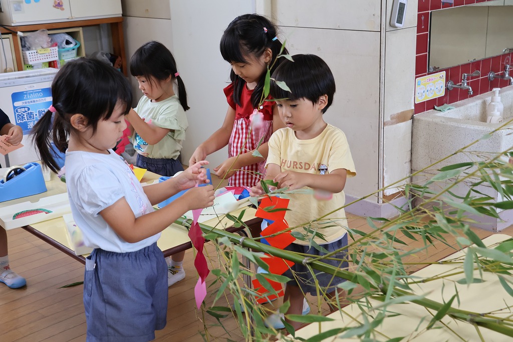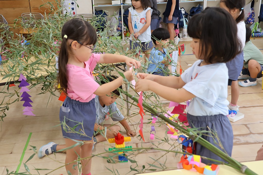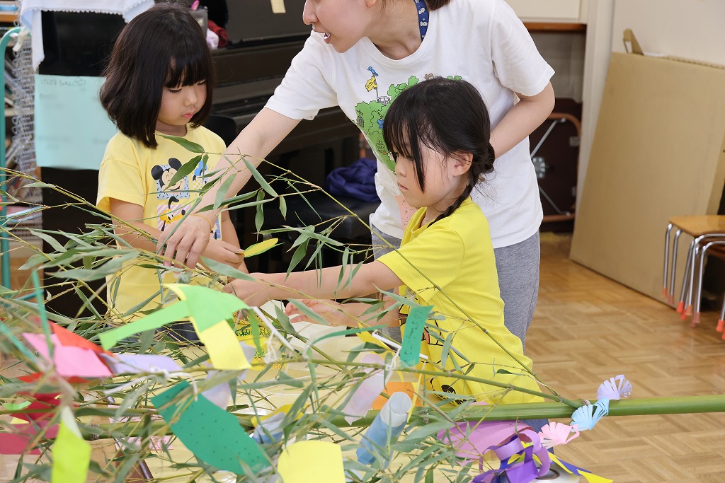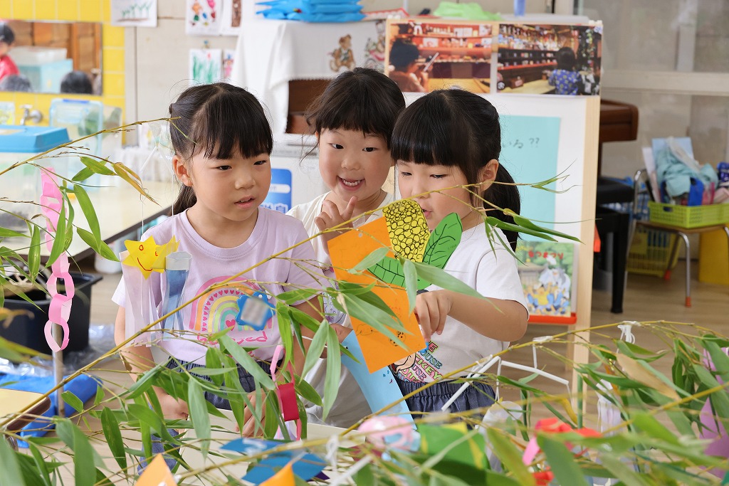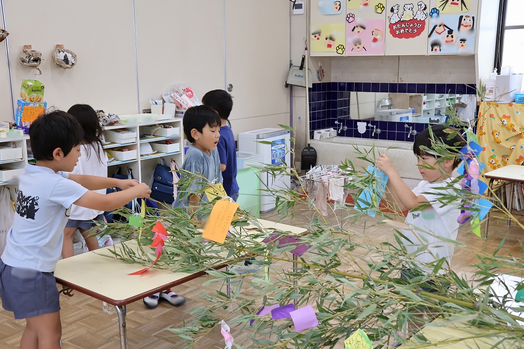 年少組さん、自分で作った折り紙の飾りやねがいごとが書かれた色画用紙を真剣な顔で笹にくっつけています。いろとりどりにたくさんの飾りがついてみんな嬉しそう~。いろんな角度から何度も眺めている子の姿もみえました。