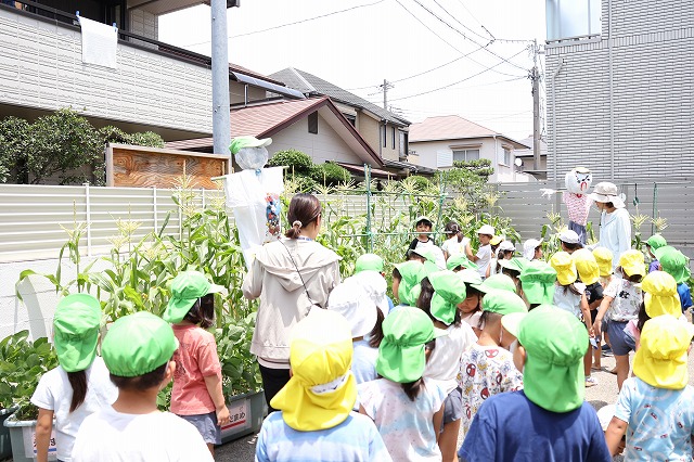 立派に育ったとうもろこしをカラスに食べられてしまわないように、年長組さん各クラスで話し合いをして…みんなで考えて…からすよけの作戦をねりました。①かかしでびっくり作戦!②CDをつるして近づけない作戦!この2つを実行して大切に大切に守ってきたとうもろこし。
