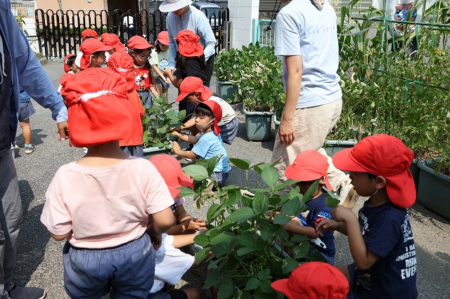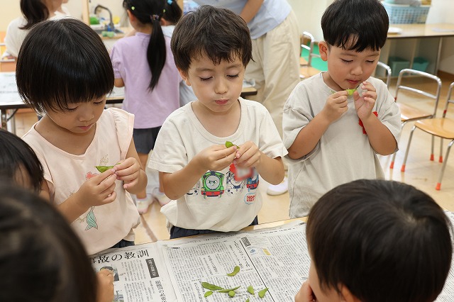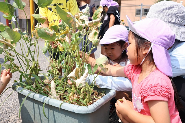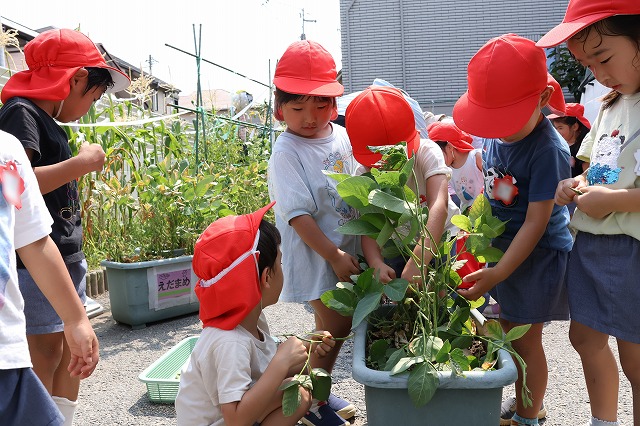 今回もお友達と一緒に収穫。2回目なので、収穫方法を覚えいた子もたくさんいました。たくさん実をつけているかな・・・と皮をむくのも楽しくて、お友達と交代したり一緒にむいたり・・(^^♪